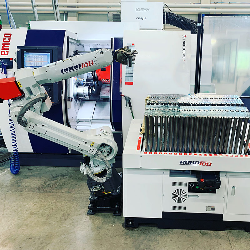- Emco E65 mit Stangenlader und Robojob TurnAssist